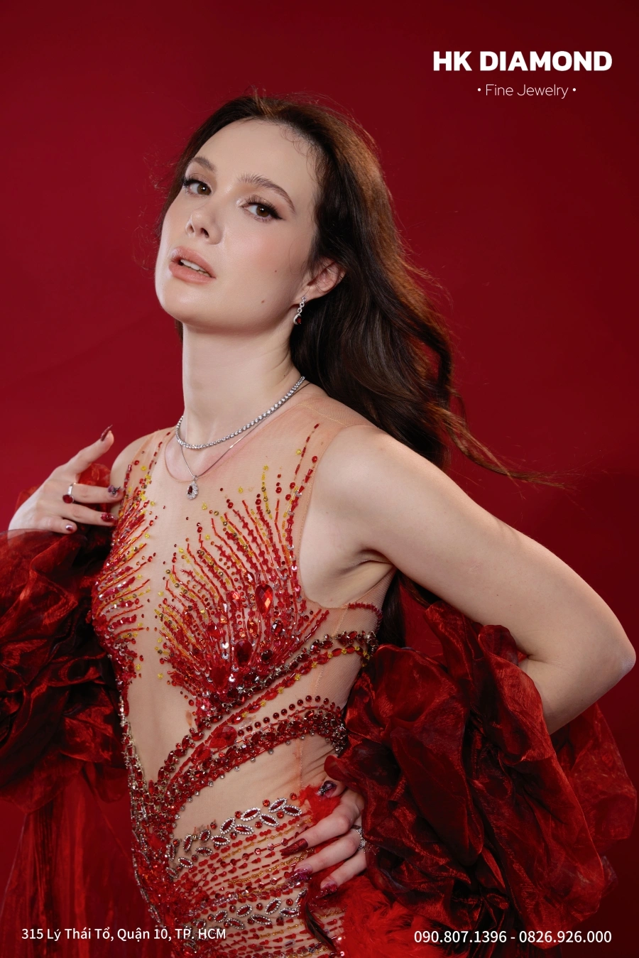 Tiếp nối dấu ấn ấy, bộ trang sức ruby đỏ rực rỡ của HK Diamond gây chú ý mạnh mẽ khi tôn vinh trọn vẹn nét đẹp quyến rũ, quyền lực và bản thân của người phụ nữ hiện đại. Sắc đỏ ruby sâu thẳm kết hợp cùng kim cương được chế tác tinh xảo đã tạo nên tổng thể sang trọng, cuốn hút và đầy khí chất. Đặc biệt, thiết kế này được Miss Charm Ukraine lựa chọn diện trong lần xuất hiện nổi bật.