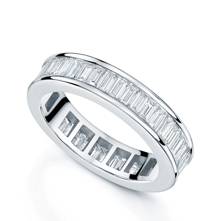 Nhẫn kiểu Eternity với các viên kim cương Baguette được xếp liền nhau quanh thân nhẫn. Thiết kế vòng quanh 360 độ khiến nhẫn luôn rực rỡ và lấp lánh từ mọi góc nhìn. Nhẫn kim cương Baguette dáng Eternity là biểu tượng cho tình yêu vĩnh cửu, phù hợp cho các dịp lễ kỷ niệm hoặc làm nhẫn cưới.