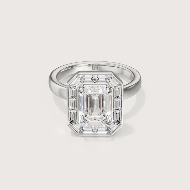 Mẫu nhẫn này với viên kim cương Baguette ở trung tâm, được bao quanh bởi một lớp Halo kim cương nhỏ. Phần viền Halo làm viên kim cương trung tâm trông lớn hơn, tạo vẻ đẹp rực rỡ và cuốn hút. Thiết kế mang đến vẻ đẹp sang trọng, tinh xảo, phù hợp với những ai yêu thích phong cách quý phái và lộng lẫy.