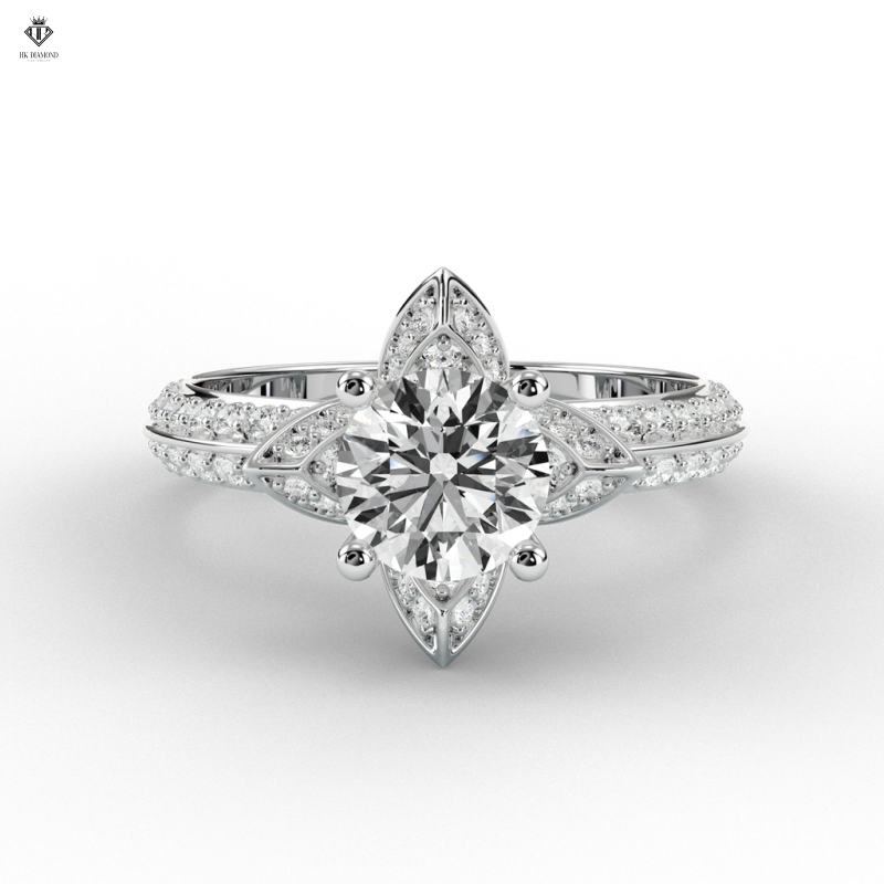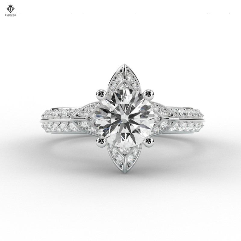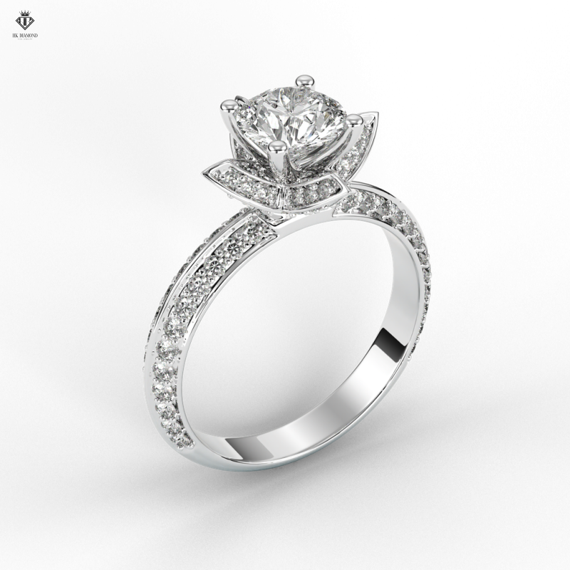 • Đính kim cương phụ: Xung quanh viên kim cương trung tâm là hàng loạt viên kim cương nhỏ dạng pavé, được sắp xếp khéo léo để tạo hiệu ứng ánh sáng tỏa đều, như một vầng hào quang lấp lánh.